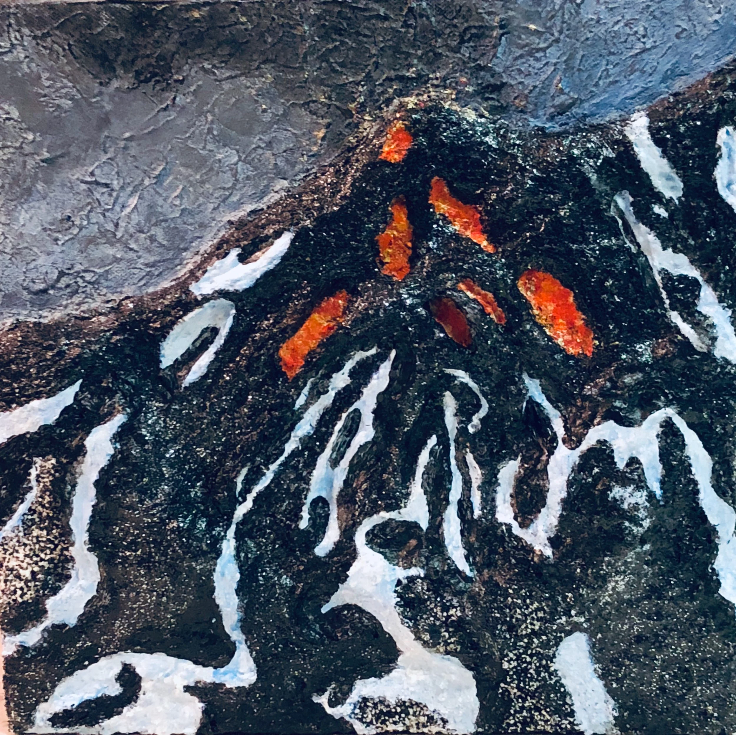 Camouflage Acrylic, Gels, Tree Bark and Branches, Stone on Canvas 12" x 12" 2019